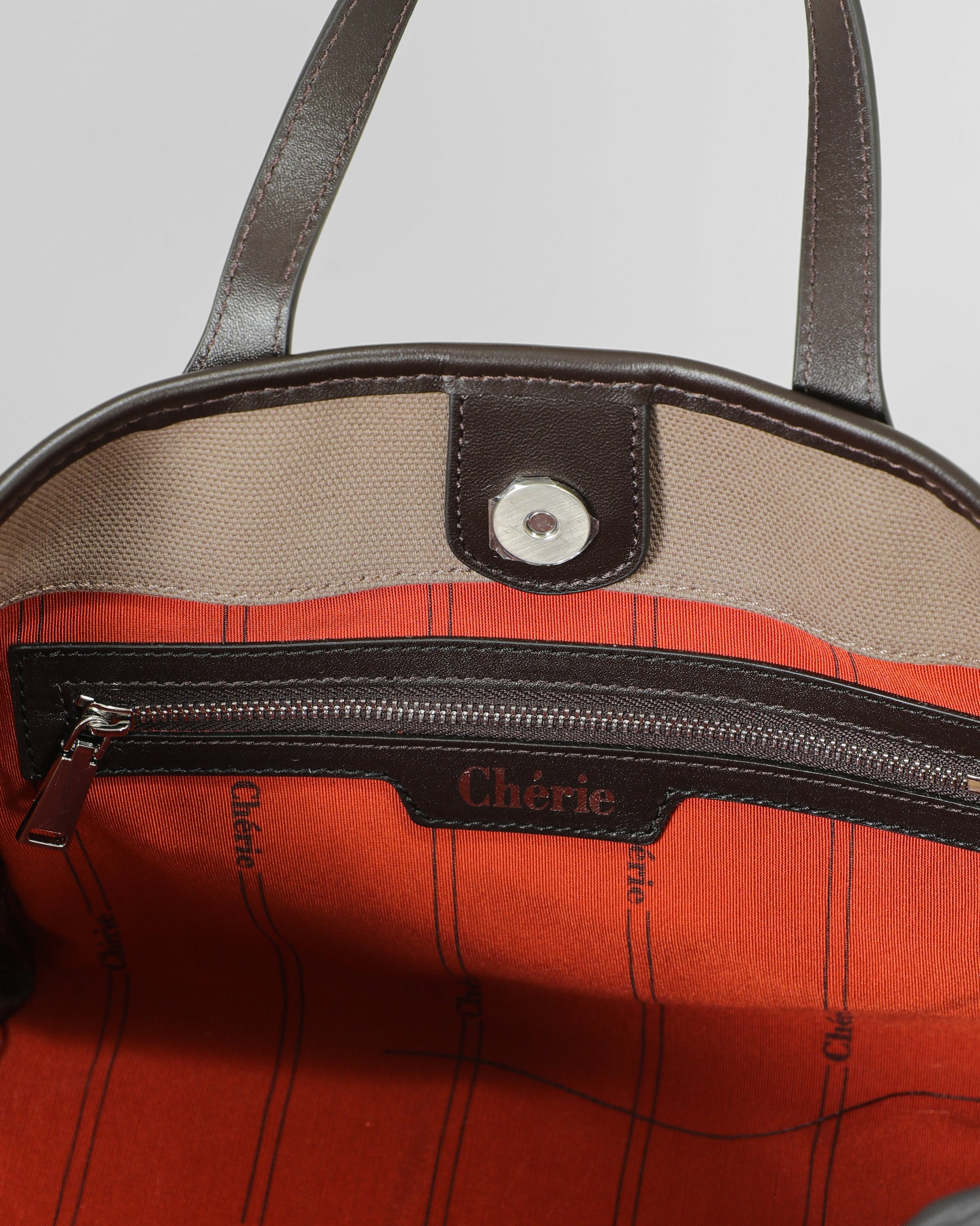 Rachel is a bag that combines luxury and elegance. Its premium waxed canvas and double-layered canvas construction emphasize durability. Its cardboard base allows the bag to stand upright, while genuine leather details exude quality.